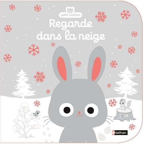 On avait déjà craqué devant Regarde dans la mer, cette fois, on change de thème mais l’idée reste la même : un livre grand format avec des teintes de blanc et d’argenté, et une touche de orange flashy. Mais surtout, des lapins tout doux à chaque page et des animaux à trouver et nommer. On ne s’en lasse pas.