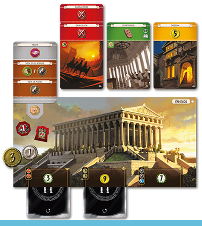 Pour le reste, les habitués retrouveront rapidement leurs marques. Car 7 Wonders vous demande toujours à trois à sept joueurs d’incarner le leader d’une cité antique. Votre but ? Développer votre cité en construisant des bâtiments civils, scientifiques et commerciaux, en renforçant votre armée et, finalement, en édifiant les fameuses merveilles.