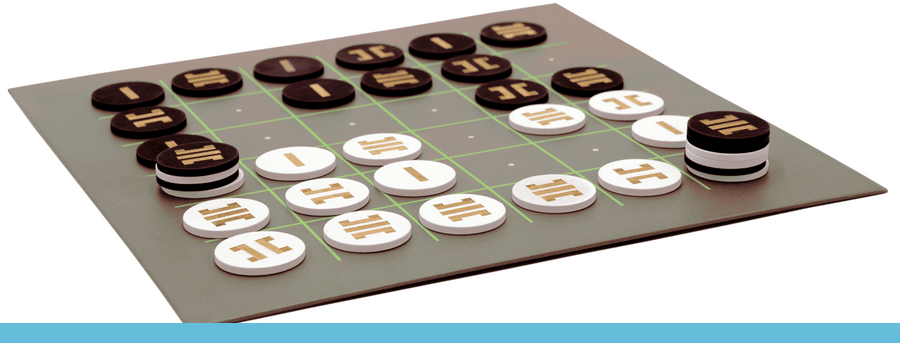 Si les trois jeux cités plus haut sont signés Claude Leroy, Kamon a quant à lui été élaboré par Bruno Cathala. Pour gagner, il vous suffit de relier deux bords du plateau ou de bloquer votre adversaire. Le premier joueur décide librement de la case qu’il va capturer à l’aide de l’un de ses anneaux. Mais il définit par la même occasion le coup que son adversaire devra jouer ensuite : soit jouer le même symbole, soit la même couleur. Vous l’aurez compris, à votre tour vous devrez prendre en compte les conditions que vous allez imposer à votre adversaire. Une minute d’inattention peut avoir des répercussions sur la suite de la partie et votre adversaire pourrait prendre l’avantage.