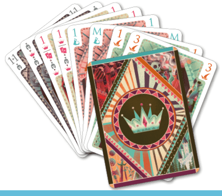 Le plateau de jeu est en réalité un tapis en tissu richement décoré de sublimes illustrations. Le roi et sa cour sont quant à eux représentés par de jolis pions en bois coloré. Enfin, les cartes ont bénéficié du même soin et contribuent à vous plonger dans l’ambiance du titre. Nous voilà prêts à commencer la partie !