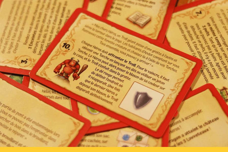 Si vous recherchiez un premier vrai jeu coopératif auquel jouer avec vos enfants à partir de 7 ans, Andor Junior est celui qu’il vous faut. Le lancer avant 7 ans semble audacieux, de même que le laisser entre les mains d’enfants jusque 12 ans non accompagnés. Et pour cause : Andor Junior a tout d’un grand. Une aventure palpitante, un beau plateau doté de nombreux éléments, des personnages uniques, des dés pour résoudre les combats… Et autant de mécaniques à assimiler. Prêts à partir à l’aventure ?