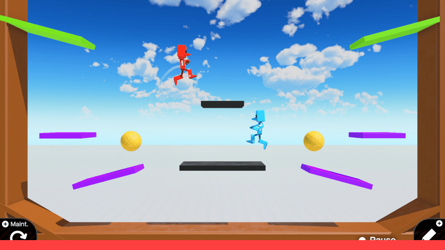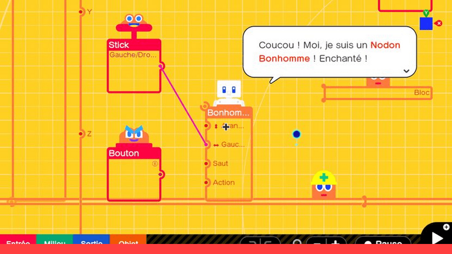 Le mode tutoriel vous permettra de créer plusieurs types de jeux vidéo de A à Z. Pas à pas, vous apprendrez à personnaliser vos personnages, placer des plateformes, programmer des réactions en chaîne, établir des conditions de succès, etc. Tout se fait de manière très progressive, sans risque de se tromper, sur un large écran rempli de Nodons, ces petits personnages programmables qui remplissent chacun une fonction dans votre jeu.