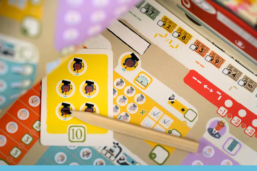 Get on Board fait partie de ces jeux appelés « flip & write » ou jeux à cocher. Chaque joueur dispose ainsi d’une feuille (presque) identique sur laquelle il va cocher les éléments qu’il croise suite aux décisions qu’il a prises lors de son tour, et qui auront évidemment une influence sur son score.