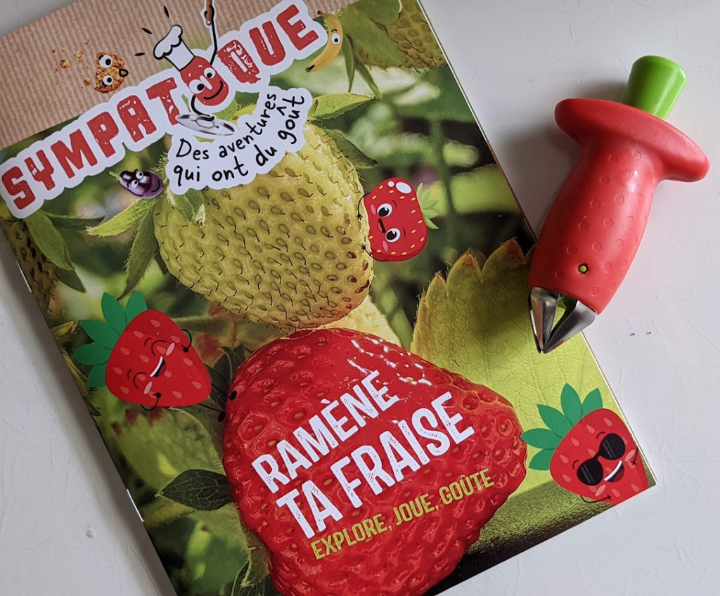 À l’intérieur, on découvre le carnet de recettes, une série d’ingrédients pour se mettre aux fourneaux, et un ustensile original. Ce mois-ci, c’est un équeuteur de fraises qui était proposé… et c’est évidemment sur celui-ci que s’est jeté l’enfant ! Adapté aux petites mains, ce petit accessoire coloré est le petit plus qui permet de motiver les troupes à s’y mettre.