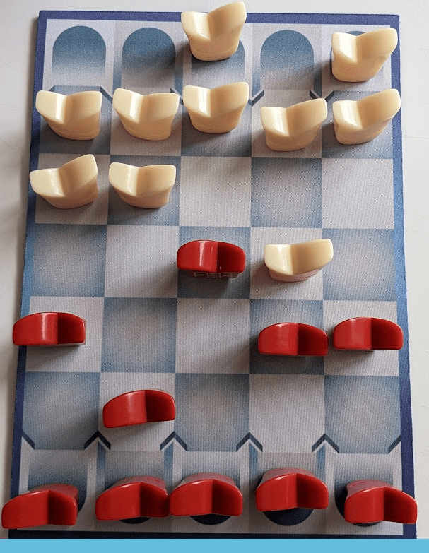 Mais tout le sel du jeu réside dans le fait que votre adversaire et vous placez vos pions de façon aléatoire en début de partie. Vous ne savez donc pas quelles pièces se trouvent derrière les masques de votre adversaire. Il va pourtant falloir le deviner, tout en trompant votre adversaire, si vous souhaitez remporter la partie.