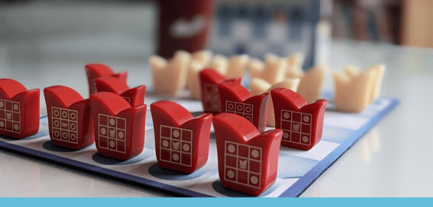 Un échiquier qui ne vous permet pas de savoir de quoi son capables les pièces de votre adversaire parce qu’elles sont cachées ? C’est tout le concept de Volto. Avancez précautionneusement pour tenter de capturer le prétendant adverse, ou utilisez la ruse pour que l’adversaire capture vos deux demoiselles par inadvertance. Des parties courtes mais pleines de suspense vous attendent dans ce jeu très accessible !