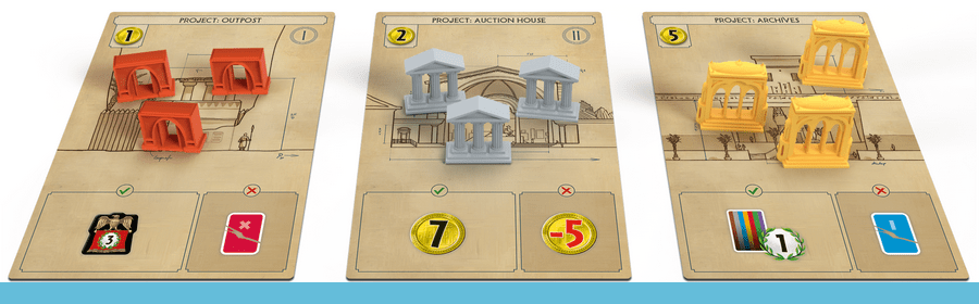 Mais d’abord : qu’apporte Édifice à une partie de 7 Wonders ? Trois grands édifices (il y avait un indice dans le titre) tellement imposants qu’ils demandent la participation de plusieurs joueurs. Si le bâtiment en question est bien construit à la fin de l’âge correspondant, ceux qui y ont contribué recevront une récompense intéressante : de l’argent, des points de victoire, des symboles militaires, ou encore des ressources. Mais si l’édifice n’est pas finalisé, ce sont les joueurs qui ont refusé de participer qui seront pénalisés.