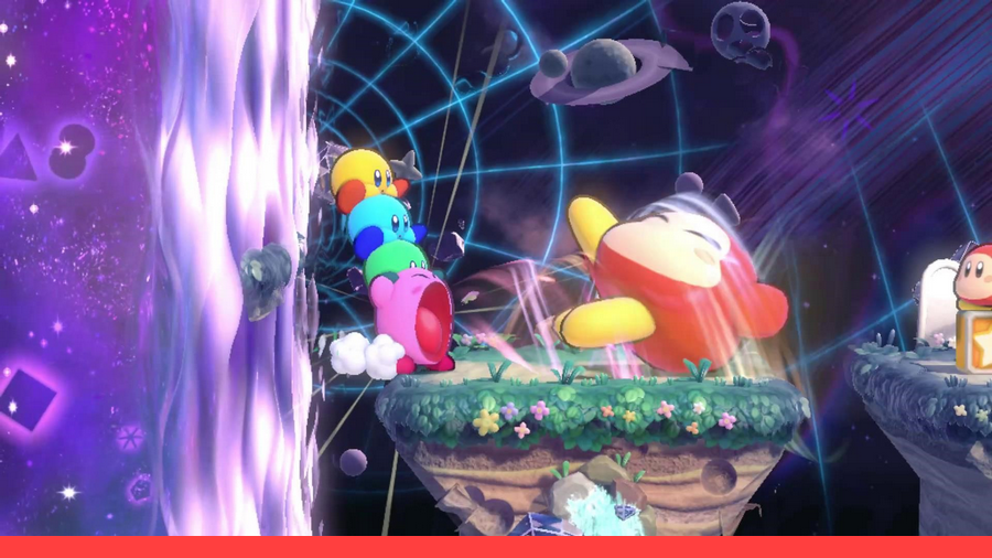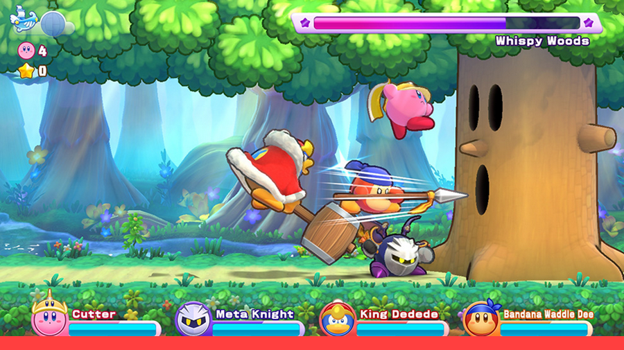 D’autant plus que jusqu’à trois joueurs supplémentaires peuvent rejoindre la partie, et ce, à tout moment. Un parent, un frère ou une sœur peut donc donner un coup de main dans les passages difficiles ou carrément parcourir le jeu complet. Les autres joueurs peuvent choisir d’incarner Kirby ou opter pour l’un des trois autres personnages qui disposent de leurs propres capacités.