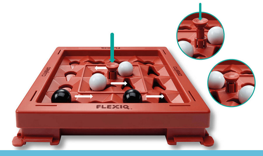 Puisque le plateau dispose de deux rotations – l’une au centre et l’autre sur l’anneau extérieur – les billes ne progressent pas au même rythme. À vous donc d’anticiper et de planifier vos actions. Car ce n’est qu’une fois que l’interrupteur a été actionné qu’on regardera la situation et qu’on vérifiera si quatre billes sont alignées. Pas avant !