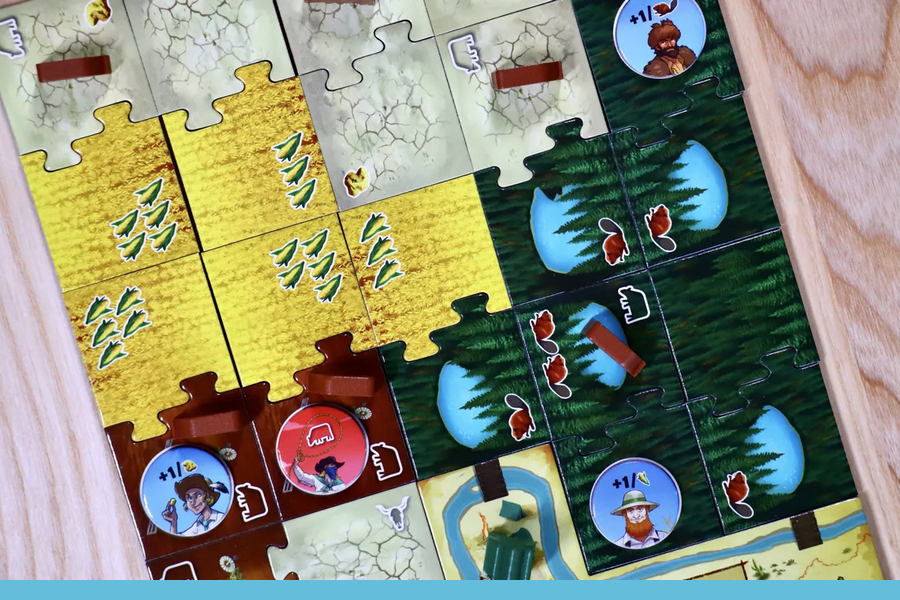 Avant toute chose, il va donc falloir sélectionner des morceaux de parcelles parmi celles présentes sur la table. Vous pouvez en stocker jusqu’à trois dans votre réserve avant de devoir les placer sur votre terrain. Spécificité ici : les morceaux s’emboitent par deux comme des pièces de puzzle. Ce n’est qu’ensuite que vous pouvez les placer, sachant qu’il faudra atteindre un territoire de 5 carrés sur 5. À vous de viser les meilleures combinaisons.