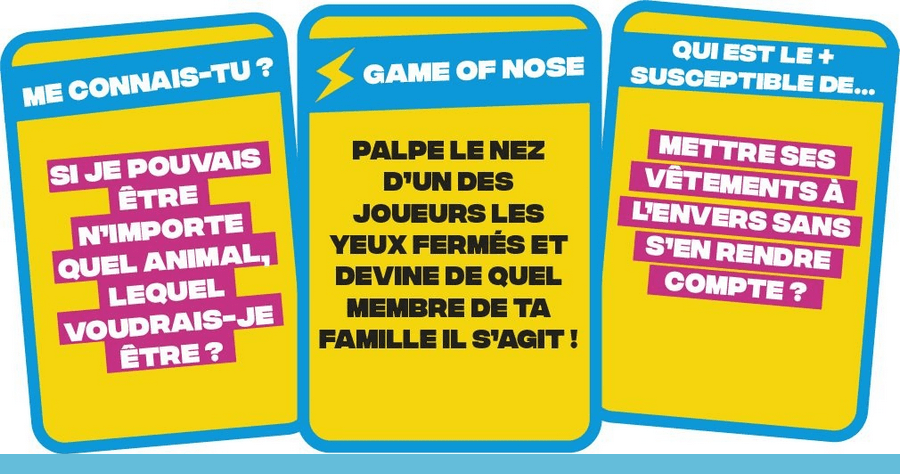 Les cartes sont réparties en plusieurs catégories : il peut s’agir de répondre à une question concernant un membre de la famille, citer qui serait le plus susceptible de faire quelque chose, faire un tour de table sur un thème précis, ou encore répondre à 5 questions à la suite. Les défis sont variés, et les questions invitent naturellement aux confidences et aux découvertes.