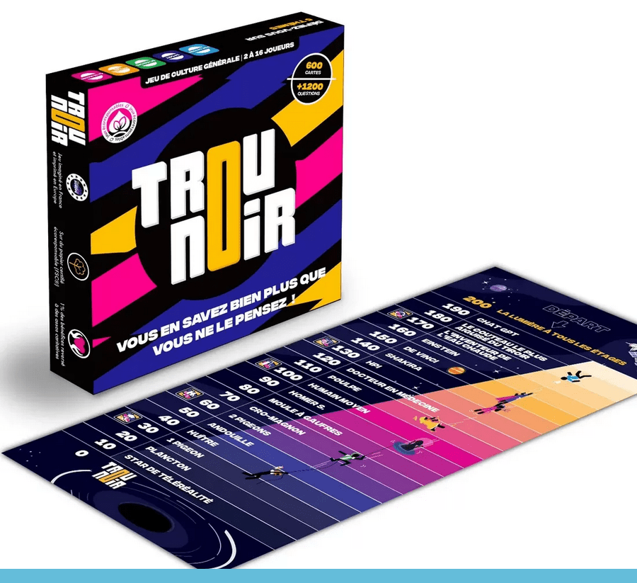 Trou Noir réunit jusqu’à 16 joueurs autour de la table pour une série de questions de culture générale. L’originalité ? Tout le monde commence avec 200 de QI. À chaque mauvaise réponse, on descend d’un échelon jusqu’à finir dans le trou noir.