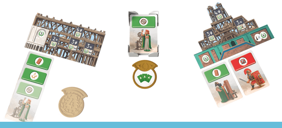 S’ils sont totalement optionnels, ceux-ci ajoutent une petite tension à la partie, voire une course entre les adversaires. Une fois remportée, une médaille n’est en effet par remplacée. Certains objectifs vous demanderont de posséder trois cartes d’une certaine couleur, de construire un certain nombre d’étapes de votre Merveille, ou encore de détenir certains jetons.