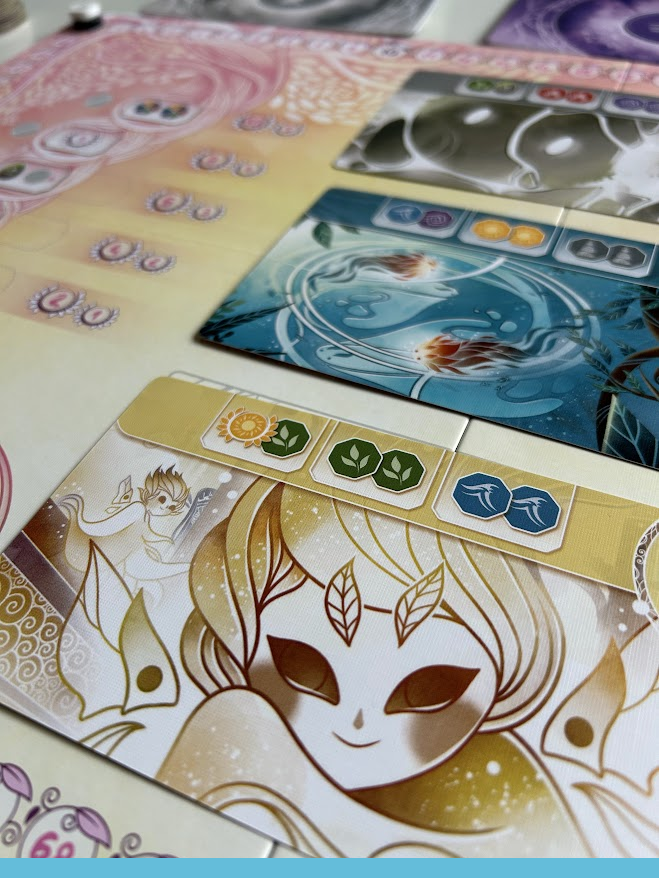 Et pourtant, le cœur du gameplay repose sur un placement d’ouvriers classique. Durant les 4 saisons qui composent la partie, vous devrez placer vos jetons offrande sur les cartes Esprit qui se succèdent au milieu du plateau ou sur l’arbre sacré pour activer des pouvoirs.